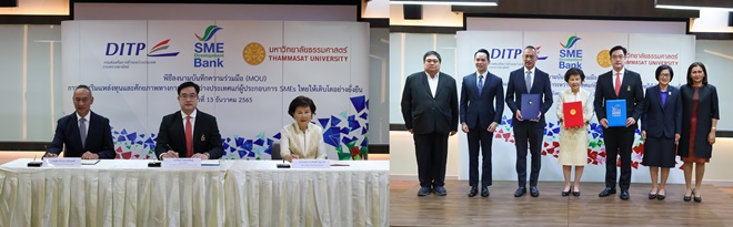 ธนาคารพัฒนาวิสาหกิจขนาดกลางและขนาดย่อมแห่งประเทศไทย (ธพว.) หรือ SME D Bank ร่วมกับ กรมส่งเสริมการค้าระหว่างประเทศ (DITP) กระทรวงพาณิชย์ และ มหาวิทยาลัยธรรมศาสตร์ (TU) ลงนามบันทึกข้อตกลงความร่วมมือ (MOU) “การส่งเสริมแหล่งทุนและศักยภาพทางการค้าระหว่างประเทศแก่ผู้ประกอบการ SMEs ไทยให้เติบโตอย่างยั่งยืน” โดยมีวัตถุประสงค์เพื่อขับเคลื่อนและสนับสนุนให้ผู้ประกอบการ SMEs ไทย เข้าถึงแหล่งเงินทุนและการส่งเสริมศักยภาพ สร้างโอกาสพาธุรกิจก้าวไกลสู่การค้าระหว่างประเทศ ผลักดันให้ผู้ประกอบการ SMEs ไทย สามารถเติบโตได้อย่างยั่งยืน โดยอาศัยกลไกการเชื่อมโยงข้อมูลของผู้ประกอบการ SMEs ไทย ระหว่างหน่วยงานพันธมิตร เพื่อพัฒนากระบวนการทำงาน รวมถึงเพิ่มศักยภาพให้ผู้ประกอบการแต่ละรายอย่างไร้รอยต่อ ณ มหาวิทยาลัยธรรมศาสตร์ ศูนย์รังสิต จังหวัดปทุมธานี เมื่อวันที่ 13 ธันวาคม 2565